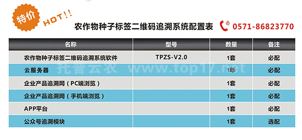 答:您可購買托普農(nóng)作物種子標簽二維碼系統(tǒng)。包括農(nóng)作物種子標簽二維碼追溯系統(tǒng)軟件、服務器、企業(yè)產(chǎn)品追溯網(wǎng)(手機端、PC端)、APP軟件,還可選配公眾號追溯模塊開發(fā)。