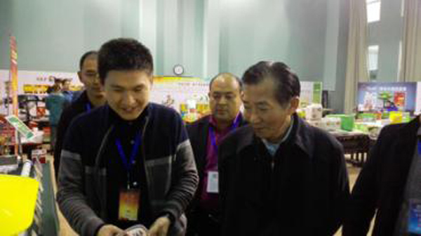 農(nóng)業(yè)部陳曉華副部長(右一)在托普云農(nóng)陳曦總監(jiān)(右二)的陪同下參觀展位