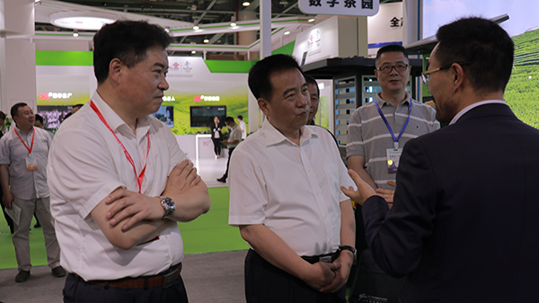 全國(guó)農(nóng)業(yè)技術(shù)推廣服務(wù)中心主任魏?jiǎn)⑽模ㄗ蠖�、園藝處處長(zhǎng)周澤宇(左一)、副處長(zhǎng)冷楊(右一)參觀托普云農(nóng)展位