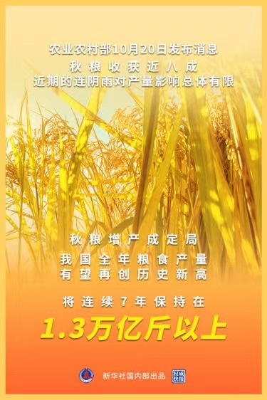 據(jù)農(nóng)業(yè)農(nóng)村部10月20日消息,目前秋糧收獲近八成,近期的連陰雨對產(chǎn)量影響總體有限,秋糧增產(chǎn)已成定局。全年糧食產(chǎn)量有望再創(chuàng)歷史新高,將連續(xù)7年保持在1.3萬億斤以上。(記者于文靜、胡璐,海報設(shè)計楊軼群)