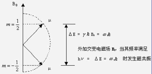 1H的自旋量子數(shù)是I=1/2,所以自旋磁量子數(shù)m=±1/2,即氫原子核在外磁場中應有兩種取向。1H的兩種取向代表了兩種不同的能級, 因此1H發(fā)生核磁共振的條件是必須使電磁波的輻射頻率等于1H的進動頻率。