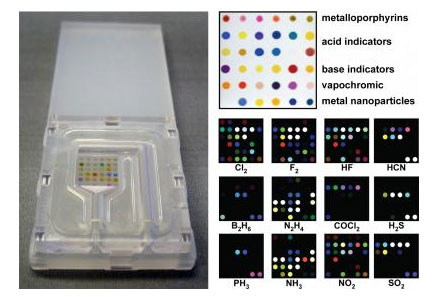 負(fù)責(zé)研制這種設(shè)備的Suslick教授表示:“我們開發(fā)的設(shè)備只不過是石蕊試紙的數(shù)字化多維碼擴(kuò)展版。我們采用了幾種不同的納米級(jí)多孔色素材料,并把這些材料排列成6x6的陣列。只要把陣列的顏色排列狀況與標(biāo)準(zhǔn)表進(jìn)行對(duì)比,就可以很快知道某環(huán)境中的化學(xué)品毒性程度�!�