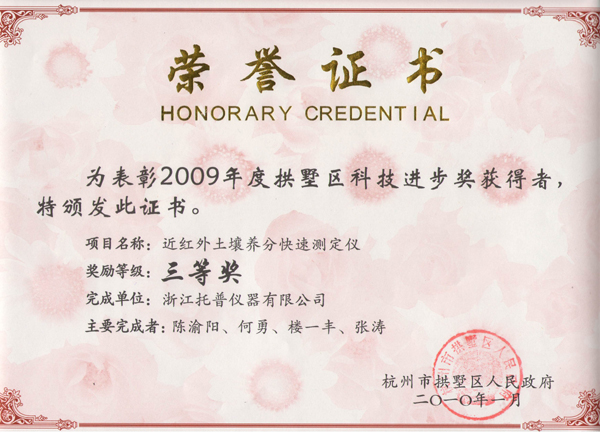 下圖是近紅外土壤養(yǎng)分快速測(cè)定儀被評(píng)為拱墅區(qū)科學(xué)技術(shù)進(jìn)步獎(jiǎng)三等獎(jiǎng)。