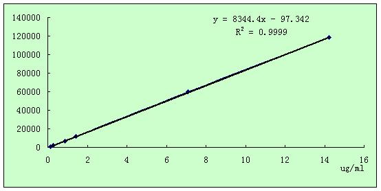 配置濃度分別為0.142、0.284、0.853、1.422、7.110、14.220μg/mL的三聚氰胺標(biāo)準(zhǔn)工作液。將以上6種標(biāo)準(zhǔn)工作液在上述色譜條件下按濃度由低至高進(jìn)樣。用最小二乘法以對(duì)照品濃度(橫坐標(biāo)X軸,µg/ ml)對(duì)峰面積(縱坐標(biāo)Y軸)進(jìn)行線性回歸,求算標(biāo)準(zhǔn)曲線。