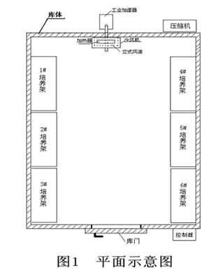 溫度系統(tǒng)由加熱器、壓縮機(jī)組、冷風(fēng)機(jī)、立式風(fēng)道、溫度傳感器和控制系統(tǒng)等組成。壓縮機(jī)組采用高效的法國(guó)美優(yōu)樂(lè)MT36(3匹)全封閉壓縮機(jī)(含進(jìn)口附配件)。冷風(fēng)機(jī)采用國(guó)產(chǎn)30m2高效低噪音冷風(fēng)機(jī)。溫度傳感器采用進(jìn)口(寧波組裝)KL型高精度熱敏電阻,具有精度高、可靠性極高。壓縮機(jī)組用支架安裝在室外,并用機(jī)罩罩住。冷風(fēng)機(jī)安裝在房門對(duì)面的頂板上,冷風(fēng)機(jī)的進(jìn)口處與位于其下的立式風(fēng)道相連接,立式風(fēng)道的進(jìn)風(fēng)出在其底部?jī)蓚?cè),如圖2所示。加熱器安裝在風(fēng)道內(nèi)。