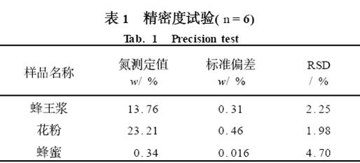取蜂王漿、花粉、蜂蜜樣品,按試驗(yàn)方法進(jìn)行6次測定,樣品測定值的相對標(biāo)準(zhǔn)偏差(RSD) 結(jié)果見表1 。