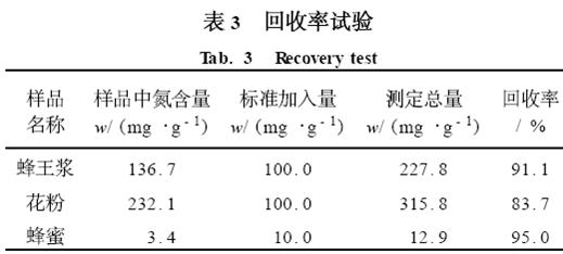 取蜂王漿、花粉、蜂密樣品,加入氨氮標(biāo)準(zhǔn)溶液,按試驗(yàn)方法進(jìn)行樣品處理與測定,回收率測定結(jié)果見表3 。