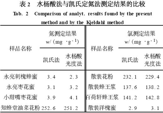 通過改進(jìn)蜂產(chǎn)品蛋白質(zhì)消化的條件,有效地縮短了反應(yīng)時(shí)間,由原來的3. 5 h 縮至2 h 左右。由于水楊酸光度法樣品消化液不需要蒸餾,直接用于測定,更適宜于批量樣品的測定,水楊酸光度法與國標(biāo)法比較無顯著性差異,所以水楊酸光度法因其操作簡便、準(zhǔn)確、迅速,可用于蜂產(chǎn)品中蛋白質(zhì)的測定。