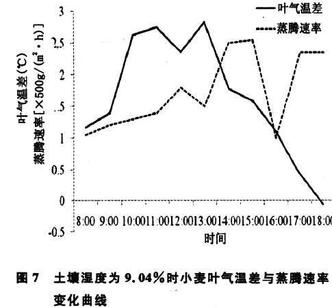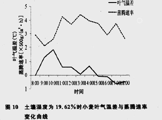 3) 土壤濕度< 15 %時,上午蒸騰速率隨著隨小麥葉氣溫差的增加而加大,12 :00 之后,蒸騰速率并不隨小麥葉氣溫差增加而增強,未表現(xiàn)出規(guī)律性。當土壤濕度超過15 %以后,從上午開始,小麥葉氣溫差和蒸騰速率的變化趨勢就相反。