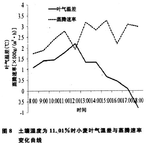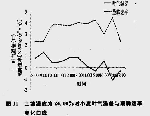 由圖7 - 11 可以看出,土壤濕度< 15 %時,在上午的11 :00 之前,蒸騰速率隨著小麥葉氣溫差的增加而加大,12 :00 之后,蒸騰速率并不隨著小麥葉氣溫差的增大而增強,未表現(xiàn)出規(guī)律性。當土壤濕度超過15 %以后,水分的充分供應既保證了較高的蒸騰速率,也有效降低了葉片溫度,減小了小麥葉氣溫差,從上午開始,小麥葉氣溫差和蒸騰速率的變化趨勢就相反。