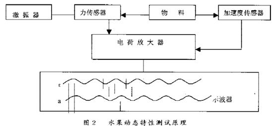 在不同預(yù)加載荷、激振功率、成熟程度等條件下,測(cè)定動(dòng)態(tài)試驗(yàn)的彈性模量和相位角。測(cè)試原理是正弦交變應(yīng)力- 應(yīng)變動(dòng)態(tài)試驗(yàn)作軸向加載時(shí),正弦力由正弦波發(fā)生器經(jīng)過放大器后,由電動(dòng)式振蕩器產(chǎn)生,一個(gè)壓電加速度傳感器固定到振蕩器軸上,樣品夾在兩個(gè)圓盤之間,一個(gè)圓盤連接到振動(dòng)器上,另一個(gè)經(jīng)動(dòng)態(tài)力傳感器連接到剛性支撐之間,以測(cè)定靜態(tài)預(yù)載荷,加速度和力傳感器的信號(hào)經(jīng)放大,通過水平和垂直通道輸入存儲(chǔ)示波器,通過調(diào)節(jié)功率放大器改變激振功率(測(cè)定輸入激振器的功率獲得激振功率),見圖2 。
