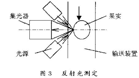 在線近紅外線內(nèi)部品質(zhì)檢測(cè)技術(shù)分為反射光式和透過光式,透過光式又分為不完全遮光式和完全遮光式。反射光式測(cè)定法是將近紅外線照射在果實(shí)赤道附近部位,并測(cè)定經(jīng)內(nèi)部擴(kuò)散之后由果實(shí)表面反射光線的一種方法,檢測(cè)原理如圖3 所示。輸送裝置將果實(shí)輸送到糖度檢測(cè)裝置處,照射在果實(shí)上的近紅外光線經(jīng)果實(shí)反射后,由集光器聚集,然后經(jīng)過分光器(濾波器),僅取出一實(shí)波長(zhǎng)的近紅外線。濾波后的光線由光電元件變換成電信號(hào),從而求出不同波長(zhǎng)下的反射強(qiáng)度,再依據(jù)事先建立的多元回歸糖度計(jì)計(jì)算模型(標(biāo)定線)由反射強(qiáng)度推算出糖度。