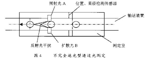 不完全遮光式透過光測(cè)定法測(cè)試原理如圖4 所示。近紅外線A 照射在果實(shí)表面上,透過果實(shí)內(nèi)部的擴(kuò)散光B 由設(shè)置在另一側(cè)的感光傳感器檢測(cè)。該方法是反射式的改進(jìn),由于照射光和感光傳感器設(shè)置在果實(shí)的兩側(cè),減少了表面反射光對(duì)感光傳感器的影響。工作時(shí),照射光連續(xù)定常照射,位于光軸上的感光傳感器用電子快門控制,僅當(dāng)果實(shí)在適當(dāng)位置時(shí)才檢測(cè)。前部設(shè)置有果徑檢測(cè)傳感器,果實(shí)經(jīng)過其間時(shí)遮斷光源,根據(jù)前部開始遮光和后部結(jié)束遮光的時(shí)間差求出果徑,并判斷出果實(shí)的中心,計(jì)算機(jī)以該中心位置為基準(zhǔn),確定開始、結(jié)束測(cè)定時(shí)刻,在該時(shí)間間隔內(nèi)進(jìn)行數(shù)次頻譜測(cè)定,然后用平均值進(jìn)行內(nèi)部品質(zhì)分析。