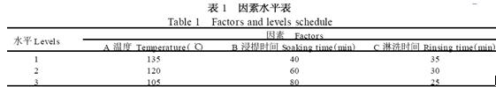 1. 4 正交設(shè)計(jì)提取方法 根據(jù)熱浸提—油重法測(cè)定原理,選定浸提溫度(A) 、浸提時(shí)間(B) 和淋洗時(shí)間(C) 作為考察因素,各設(shè)3 個(gè)水平,選用L9 (34 ) 正交表進(jìn)行試驗(yàn)(見表1) ,三次重復(fù)。
