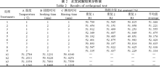 1. 6 數(shù)據(jù)分析 粗脂肪含量( %) = (W2 - W1 ) ×100/ W0 ,正交試驗(yàn)結(jié)果的統(tǒng)計(jì)分析參考明道緒主編的有重復(fù)觀測(cè)值正交試驗(yàn)結(jié)果,用新復(fù)極差法進(jìn)行多重比較,在DPS 7. 05上完成。
