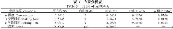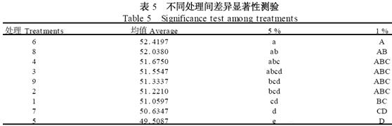 (0. 8468) > RA (0. 1343) ,即淋洗時(shí)間對(duì)測(cè)定結(jié)果影響最大,其次是浸提時(shí)間,浸提溫度的影響最小。方差分析結(jié)果表明(表3) ,因素B (浸提時(shí)間) 和因素C(淋洗時(shí)間) 各水平間差異顯著, 因素A(浸提溫度) 各水平間差異不顯著。由于因子A 不同水平間差異不顯著,結(jié)合B、C 因素各水平間的平均數(shù)和顯著性測(cè)驗(yàn)結(jié)果(表4) ,B3C3 和B3C2 應(yīng)為較好的提取方案。它們相對(duì)應(yīng)于處理3 (A1B2 C3 )和處理6 (A2B3 C2 ) ,在9 個(gè)處理中分別位于第四位和第一位(表5) 。綜上所述,A2B3 C2 應(yīng)為最優(yōu)組合,即浸提溫度120 ℃、浸提時(shí)間80 min、淋洗時(shí)間30 min 為花生粗脂肪的最佳提取方案。