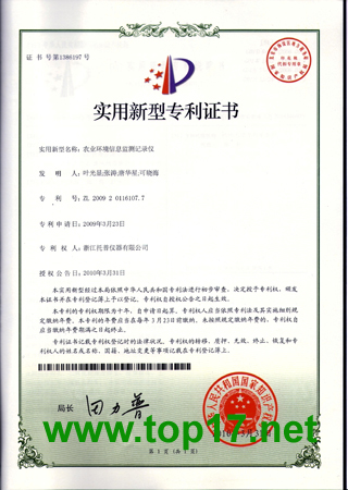 多年來,浙江托普儀器有限公司在產(chǎn)品研發(fā)上一直孜孜以求,投入很大的人力與財(cái)力,以繼續(xù)保持并發(fā)揚(yáng)浙江托普的品牌。此次浙江托普農(nóng)業(yè)環(huán)境記錄儀獲實(shí)用新型專利和軟件著作權(quán)就是一個(gè)很好的證明,我們會(huì)繼續(xù)努力,不辜負(fù)廣大朋友對(duì)我們的信賴與支持!