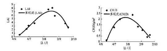 在水稻的光合作用過(guò)程中影響水稻有機(jī)物質(zhì)合成的主要因素有葉面積(LAI)、葉綠素含量(CH.D)、陽(yáng)光、二氧化碳的濃度等,在光合反應(yīng)過(guò)程中葉面積過(guò)大也不一定會(huì)利于植物的有機(jī)物質(zhì)的合成,而水稻的葉面積以及葉綠素含量增加有一定的規(guī)律的,通過(guò)使用便攜式葉面積測(cè)定儀對(duì)水稻的葉面積來(lái)進(jìn)行測(cè)量,接著通過(guò)使用葉綠素計(jì)來(lái)對(duì)葉綠素含量進(jìn)行測(cè)量,得出如下圖顯示: