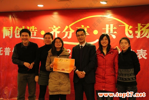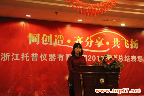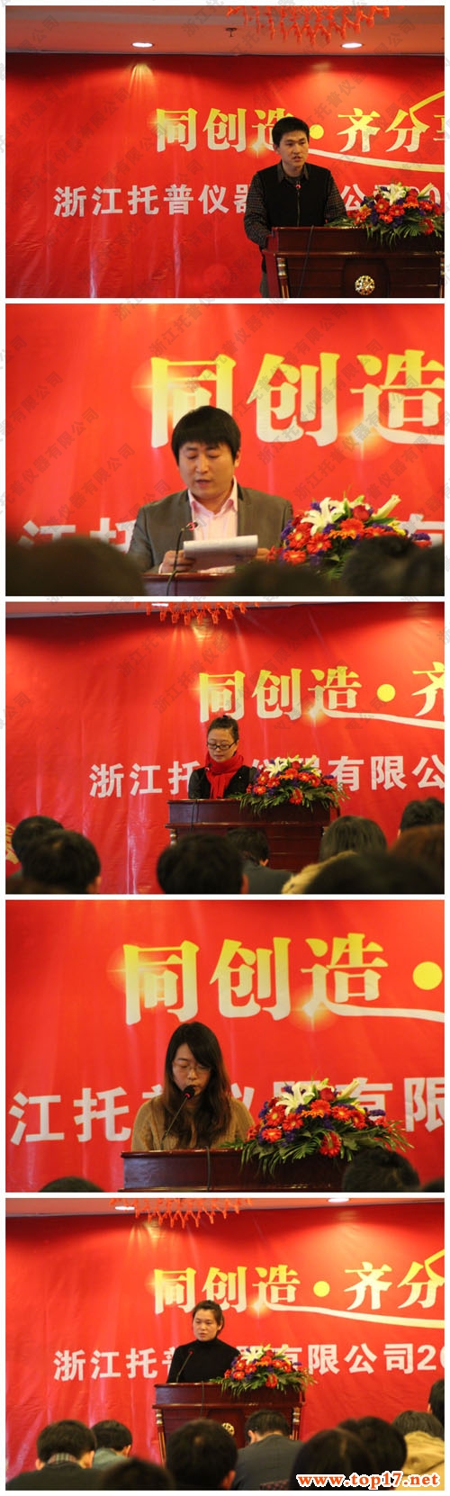 本次大會(huì)的議程共有五項(xiàng)。一、由陳渝陽總經(jīng)理做2011年的工作總結(jié)報(bào)告,并提出2012年的工作重點(diǎn)是不斷完善現(xiàn)有產(chǎn)品的品質(zhì)控制及加強(qiáng)各個(gè)部門的團(tuán)隊(duì)建設(shè);二、是由公司各副總對(duì)2011年度工作進(jìn)行匯報(bào)總結(jié),并指出對(duì)2012的展望及規(guī)劃;三、由銷售內(nèi)貿(mào)部、外貿(mào)部、市場(chǎng)部、生產(chǎn)部、研發(fā)部、技術(shù)部、網(wǎng)絡(luò)部、財(cái)務(wù)部、人事部、行政部等各部門經(jīng)理分別上臺(tái)匯報(bào)11年各部門工作取得的成績(jī)及存在的不足,并對(duì)2012年工作進(jìn)行了合理規(guī)劃;四、由公司總經(jīng)理、各分管副總為浙江托普儀器年度優(yōu)秀新人、優(yōu)秀員工、優(yōu)秀主管、總經(jīng)理特別獎(jiǎng)等獲獎(jiǎng)人員進(jìn)行表彰;四、向先進(jìn)單位和優(yōu)秀個(gè)人頒獎(jiǎng),為托普精英們頒發(fā)證書和獎(jiǎng)金并合影留念;五、公司迎新春晚會(huì)。