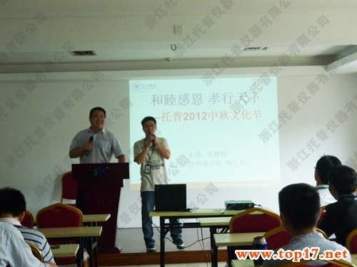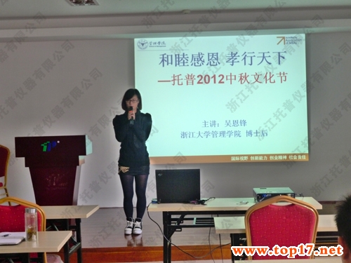 2012年9月22日,在中秋佳節(jié)來臨之際,浙江托普儀器有限公司在公司內部舉辦了一場2012年中秋文化節(jié)活動�;顒訃@“和睦感恩,孝行天下”的主題開展,并邀請浙江大學管理學院吳恩峰博士前來培訓講解。