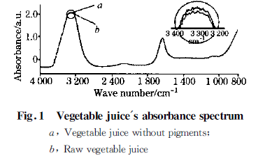 儀器參數(shù)設(shè)定:光譜采集范圍2 000 !200 cm-1 ,分辨率為1 cm-1 ,掃描次數(shù)為16 次。用濾紙過濾蔬菜汁,視過濾兩遍后顏色清澈的蔬菜汁不含色素。分別檢測蔬菜汁原汁及其經(jīng)濾紙過濾后不含色素情況下的光譜。