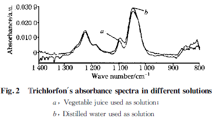如圖2 所示�?梢�,敵百蟲的特征吸收峰位置在2 種溶劑中均能夠得到良好的反映。由常識可知,白菜葉片組織的絕大部分由水構(gòu)成,因此農(nóng)藥在蔬菜中的吸收應(yīng)與在水溶液中的基本相同。實驗結(jié)果顯示,農(nóng)藥敵百蟲在2 種溶劑中的吸收峰位置完全吻合;在蔬菜汁中的吸光度略低于在蒸餾水溶液中的,可能是未濾除的蔬菜纖維等雜質(zhì)的吸收造成的影響。