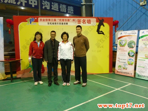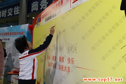 參賽期間,張玉香同志在羽毛球比賽簽名墻上簽名留念,并與全國(guó)農(nóng)技推廣中心杭大鵬書(shū)記、贊助商托普儀器陳渝陽(yáng)總經(jīng)理等人合影留念。