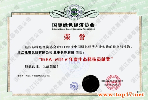 浙江托普儀器有限公司陳渝陽總經(jīng)理應(yīng)邀出席此次會(huì)議,并榮獲由國際綠色經(jīng)濟(jì)協(xié)會(huì)頒發(fā)的“IGEA—2012年度生態(tài)科技貢獻(xiàn)獎(jiǎng)”,此獎(jiǎng)項(xiàng)是經(jīng)國際綠色經(jīng)濟(jì)協(xié)會(huì)對(duì)2012年度中國綠色經(jīng)濟(jì)產(chǎn)業(yè)時(shí)間的盤點(diǎn)與推選而獲得。