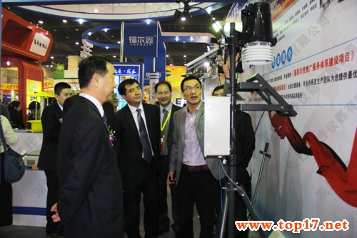 圖為:陳總為業(yè)界領(lǐng)導(dǎo)介紹固定式無(wú)線農(nóng)業(yè)氣象綜合監(jiān)測(cè)站
