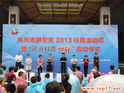 2013年5月17日上午,拱墅區(qū)2013年科技活動(dòng)周暨“運(yùn)河科普視界”活動(dòng)啟動(dòng)儀式在小河路中國(guó)杭州刀剪劍博物館廣場(chǎng)隆重舉行。此次科技活動(dòng)周主題為“科技推動(dòng)創(chuàng)新 建設(shè)幸福拱墅”。杭州市科協(xié)主席鄔麗娜、杭州市科委副巡視員徐植、浙江省科協(xié)科普部副部長(zhǎng)姜曉東、拱墅區(qū)四套班子領(lǐng)導(dǎo)、市科委、市科協(xié)、浙大城市學(xué)院、浙江樹人大學(xué)等領(lǐng)導(dǎo)應(yīng)邀出席開(kāi)幕式。區(qū)各相關(guān)機(jī)關(guān)單位、職能部門、街道科協(xié)、區(qū)屬學(xué)(協(xié))會(huì)、轄區(qū)高校、高新技術(shù)企業(yè)代表、社區(qū)居民等500多人參加開(kāi)幕式,共同啟動(dòng)了2013年拱墅區(qū)科技活動(dòng)周暨“運(yùn)河科普視界”活動(dòng)。