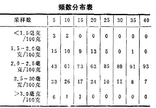 因為平均是2.345毫克/百克土,可以認為在2.0一2.5毫克/百克土間近似平均值范圍,在此范圍內出現(xiàn)頻數(shù)越多,其采樣伐表性越好。假設,每次只采五點混合樣品進行分析,在一百次中,僅有43次可能接近平均值,有9次機會不是高于3.0毫克/百克土,或者低于1.5毫克/百克土。