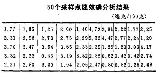 在調查的耕地上,以等距離方格法,單點采集土壤樣品50個,單獨以相蘭法分析其速效磷,五十點樣品速效磷分析結果如表2,表2中次序是采樣點的實際位置。50點速效磷分析結果的均值僅2.349毫克/百克土,極差(R)4.51,方差(52)1.1,不均勻率(CV)0.348。