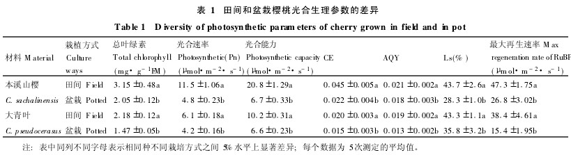 由表1可看出,田問栽培的本溪山櫻及大青葉的Pn均顯著高于其盆栽植株,分別是盆栽植株的,(2跳2.40倍和1.45倍。葉綠素含量也表現(xiàn)出與Pn相似的規(guī)律(2005年6月初測定本溪山櫻及大青葉的葉綠素含量分別為同作者前期2006)研究結(jié)果相比(3.24士0.18)、EVI),田問本溪山櫻葉綠素含量沒有明顯的變化,田問大青葉則下降了249010.22)mg"g-而兩種盆栽植株葉綠素含量均下降明顯,表明盆栽櫻桃生長后期葉綠素降解較早,這可能是導(dǎo)致盆栽植株光合能力下降的原因之一。從氣孔限制值(Ls)上看,兩種田問櫻桃問無明顯差異,但均顯著大于其相應(yīng)的盆栽植株,化效率說明盆栽植株P(guān)n下降不是氣孔限制而是葉肉的光合能力差異造成的,因?yàn)樘飭栐耘嘀仓甑乃?CE),RuBP最大再生速率和表觀量了效率(AQY)均顯著高于盆栽植株。