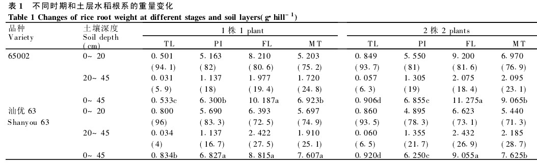 根系重量以開花期為最大,從分蘗期到開花期根系重量為增長階段,開花后為下降階段.1998年根系生長動態(tài)與1999年趨勢相同,現(xiàn)以1999年資料為例說明.開花期總根量除汕優(yōu)63單本種植外其它處理均顯著高于其它時期,分蘗期根量顯著低于其它時期(表1).65002從分蘗期到穗分化期和穗分化期到開花期根系重量平均增長519和411g,開花期到成熟期根量平均下降218g.汕優(yōu)63從分蘗期到穗分化期和穗分化期到開花期根系重量平均增長517和214g,開花期到成熟期根量平均下降114g(表1).由此可見,水稻根系重量的主要增長期在分蘗期到穗分化期.花后根系重量下降主要發(fā)生在0~20cm耕層中,65002和汕優(yōu)63分別下降2162g和0194g,而土層20~45cm的深層根系重量下降相對較小(表1).每筒種植2株比1株各生育期根量均增加.