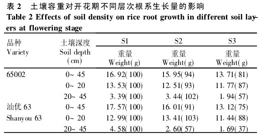 以土壤容重標(biāo)示的土壤緊密度影響根系的生長,隨土壤容重提高,開花期水稻根系生長量下降.以112g#cm-3土壤容重的根系生長量為100%,在114g#cm-3和116g#cm-3土壤容重下65002根系生長量分別為94%和81%,下降6%和19%,汕優(yōu)63分別為91%和75%,下降9%和25%(表2).