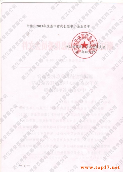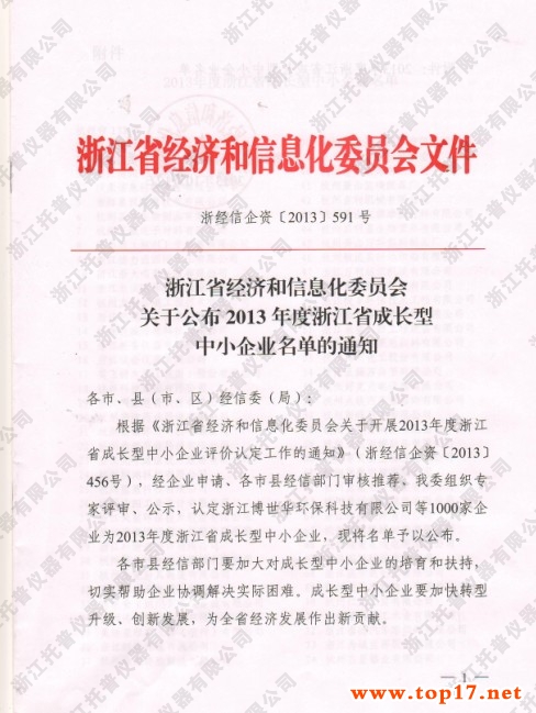 圖為:2013年度浙江省成長(zhǎng)型中小企業(yè)名單(托普儀器在第十五位紅線(xiàn)處)