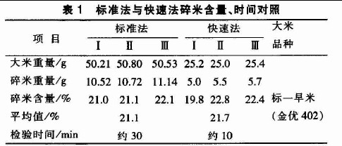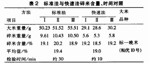從檢驗(yàn)過(guò)雜質(zhì)的大米樣品中,用分樣器平均分取約25g大米,倒人合適也徑的篩層內(nèi),以每秒1轉(zhuǎn)的速度,回轉(zhuǎn)半徑約10 cm,在玻璃板上正反時(shí)針回轉(zhuǎn)各篩10圈,取出篩,將篩上大米小心倒在玻璃板一端,將篩下物倒人樣品盤內(nèi),重新套好篩層,再將篩下物倒人篩內(nèi),以同樣的方法再篩選2次。第二次正反時(shí)針回轉(zhuǎn)各篩8圈,第三次篩4圈。將篩上物和篩下物分開(kāi)倒在玻璃板上。按規(guī)定揀出碎米中的整米、整米中的碎米,用感量0.1 g的天平稱取碎米重量,計(jì)算碎米含量,記錄每次檢驗(yàn)時(shí)間。檢驗(yàn)結(jié)果對(duì)照見(jiàn)表1、表2