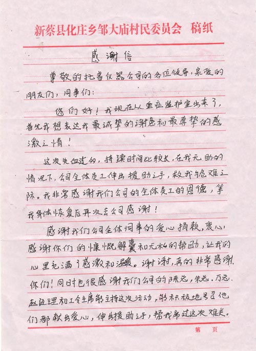 1月15日,公司收到劉學(xué)義寫來(lái)的信,信中他告訴托普家人他的病情已好轉(zhuǎn),術(shù)后已由重癥監(jiān)護(hù)室轉(zhuǎn)入普通病房,等待觀察與休養(yǎng)。長(zhǎng)長(zhǎng)的一封信,給同事們帶來(lái)了喜悅的消息,也傾訴著他對(duì)托普家人的深深謝意!