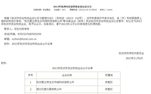 根據(jù)《杭州市農(nóng)業(yè)科技企業(yè)認(rèn)定與管理辦法》(杭科農(nóng)〔2013〕152號),經(jīng)市科委組織專家對各區(qū)、縣(市)科技局推薦上報(bào)的材料進(jìn)行審核,“浙江托普儀器有限公司”等34家企業(yè)(附件)符合杭州市農(nóng)業(yè)科技企業(yè)認(rèn)定要求,擬認(rèn)定為2013年杭州市農(nóng)業(yè)科技企業(yè)。