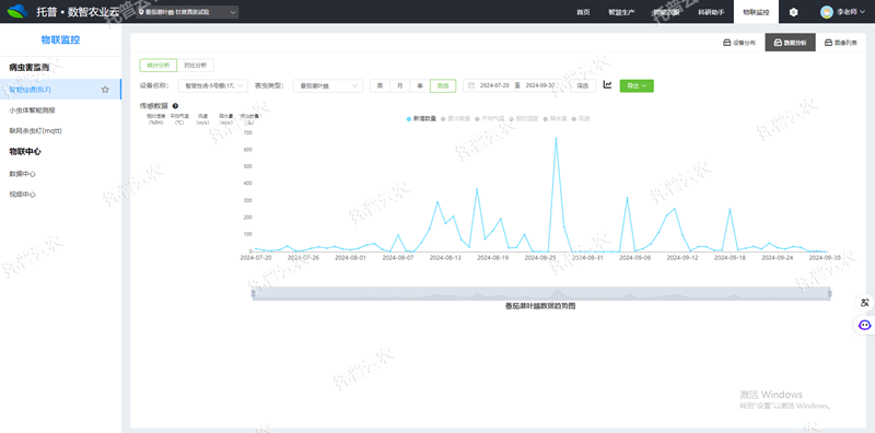 3、AI識別計數(shù),實時監(jiān)測:AI識別番茄潛葉蛾,自動計數(shù),準確率高達95%以上,自動生成番茄潛葉蛾發(fā)生趨勢圖。