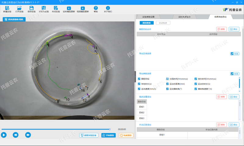 托普TP-KCXW昆蟲行為分析系統(tǒng)是由昆蟲行為分析系統(tǒng)軟件、專用筆記本電腦、高清高幀工業(yè)相機(jī)組成。使用專用軟件對錄制的昆蟲活動視頻或傳入實(shí)時昆蟲觀測視頻流進(jìn)行分析,識別并跟蹤目標(biāo)昆蟲,獲取昆蟲隨時間變化的(X,Y)坐標(biāo),同時記錄輸出十余種昆蟲運(yùn)動相關(guān)參數(shù),記錄運(yùn)動軌跡圖,實(shí)現(xiàn)昆蟲運(yùn)動可視化分析,輔助昆蟲行為研究。