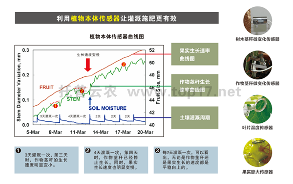 植物本體傳感器,能實時或階段性地監(jiān)測植物莖稈粗細(xì)的變化、葉面的溫度、莖流速率、果實增重與膨大速率、植物的光合作用等植物本身的一些參數(shù),能直觀地反應(yīng)植物的生長狀態(tài)。通過對作物參數(shù)的測量可直觀反映土壤或空氣環(huán)境參數(shù)對作物的影響,從而指導(dǎo)用戶更加科學(xué)合理地調(diào)控生產(chǎn)環(huán)境,以達到作物高產(chǎn)優(yōu)質(zhì)。